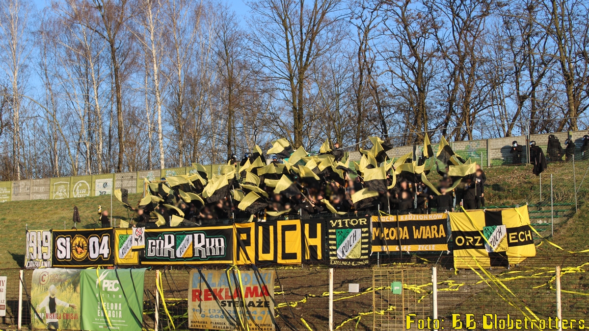 Przybycie Ruchu Radzionków na GKS Szombierki Bytom zawsze wzbudzało większe zainteresowanie wśród lokalnych kibiców i nie inaczej było w sobotę. Na trybunach tego ogromnego stadionu, który kiedyś mógł pomieścić około 30 000 osób, zasiadło około 500 widzów w tym nasza, blisko stuosobowa grupa z Radzionkowa.