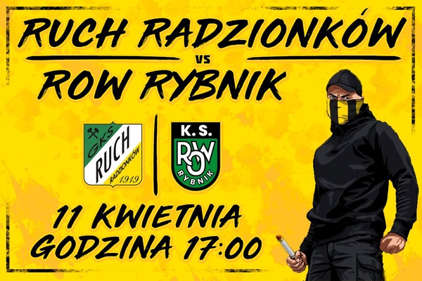 Zarząd Ruchu Radzionków umieścił na swojej stronie informacje organizacyjne, dotyczące sobotniego meczu z ROWem Rybnik.Sobotni mecz Ruchu Radzionków z ROW-em 1964 Rybnik już dziś budzi wielkie emocje. Spodziewając się świetnego, piłkarskiego widowiska informujemy jednocześnie, że spotkanie zostało zakwalifikowane do rangi wymagającej "Podwyższonych standardów bezpieczeństwa". W związku z tym przedstawiamy ważne informacje dotyczące warunków zakupu biletów i wejścia na obiekt przy Knosały: