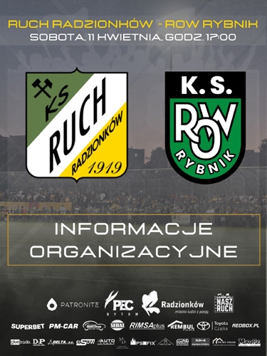 Zarząd Ruchu Radzionków umieścił na swojej stronie informacje organizacyjne, dotyczące sobotniego meczu z ROWem Rybnik.Sobotni mecz Ruchu Radzionków z ROW-em 1964 Rybnik już dziś budzi wielkie emocje. Spodziewając się świetnego, piłkarskiego widowiska informujemy jednocześnie, że spotkanie zostało zakwalifikowane do rangi wymagającej "Podwyższonych standardów bezpieczeństwa". W związku z tym przedstawiamy ważne informacje dotyczące warunków zakupu biletów i wejścia na obiekt przy Knosały:
