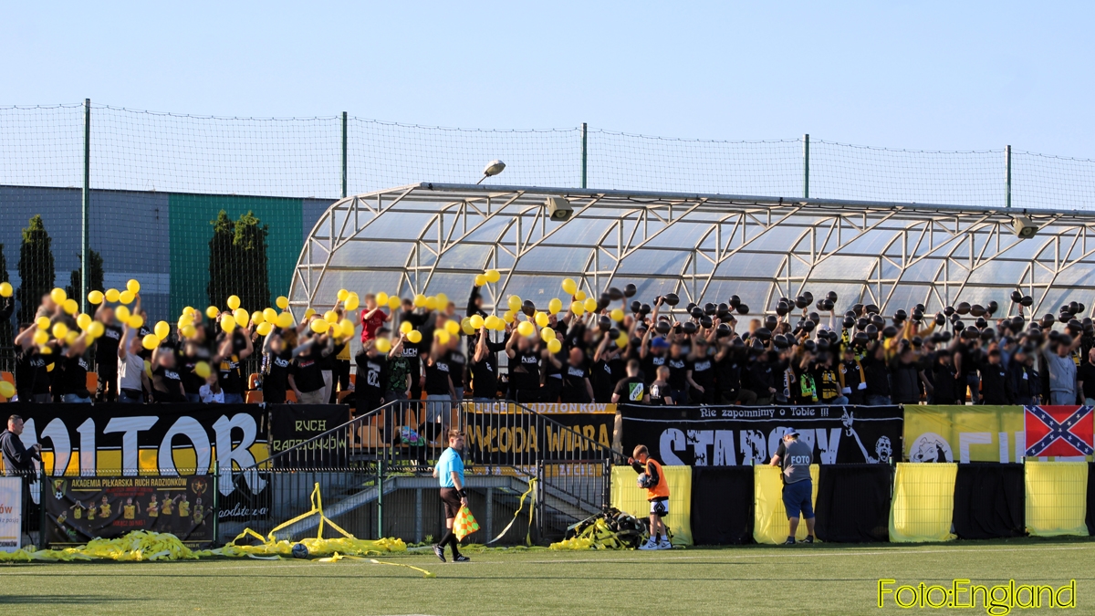 W niedzielne popołudnie na mecz w Łaziskach Górnych wybrało się 45 kibiców Ruchu Radzionków.Tak się złożyło, że w rundzie wiosennej ten kierunek był dla nas najatrakcyjniejszy, lecz nie ma co porównywać tego spotkania do pojedynków z Odrą Wodzisław czy ROWem Rybnik, ale grając cały czas w tak niskich ligach, trzeba się cieszyć z tego, co jest.